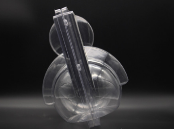 開展的PET折起來雙泡殼單折起來槽 折起來后的雙泡殼折起來后的雙泡殼,留意該泡殼是用交疊的按扣將正反兩面扣在一塊單折起來槽呈園弧狀